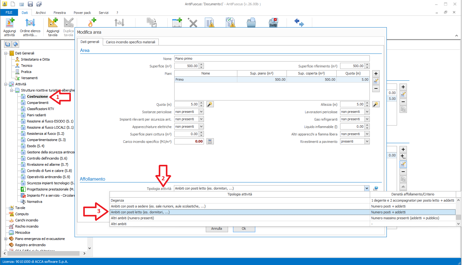 gerardop | gerardop 2024-11-14 09:44:46 Il numero di posti letto va inserito nelle varie aree create nel nodo "Costruzione", in particolare nella sezione affollamento, scegliendo, nel campo "Tipologia attività", "Degenza" o "Ambiti con posti letto", è possibile inserire il numero di posti letto per ogni area. |