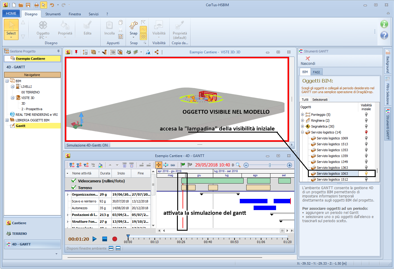 | 4D Gantt: cosa si intende per Visibilità inizialePatrizio 2026-03-24 14:35:55 Voglio condividere una richiesta di assistenza Richiesta: Nel 4D Gantt, nel toolbox Strumenti gantt è riportato un elenco di oggetti e di fianco una lampadina nella colonna denominata Visibilità iniziale. Non comprendo cosa si intende per Visibilità iniziale e come bisogna operare. Risposta: Chiariamo subito cosa si intende per Visibilità iniziale. Selezionando (accendendo) per un oggetto in elenco la lampadina corrispondente, presente nella colonna Visibilità iniziale si rende l'oggetto visibile da subito all'avvio della simulazione del cantiere nel gantt. Clicca QUI per visualizzare una immagine. Volendo ampliare il discorso, chiariamo alcuni altri aspetti. Il toolbox Strumenti gantt riporta TUTTI gli oggetti modellati all'interno del nostro cantiere. Compaiono in questo elenco in modo tale che sia possibile selezionarli e di seguito collegarli ad un task presente sul diagramma. Questa operazione (di collegare ad un task gli oggetti del cantiere), eseguita per tutti gli oggetti, consente di avere una simulazione nel tempo dell'evoluzione del cantiere. Avviando sul diagramma la simulazione, gli oggetti compariranno nel modello, nel periodo in cui è stato definito l'inizio del task a cui sono associati. Questo è in linea di massima il funzionamento del gannt collegato alla simulazione dell'evoluzione del cantiere. Guarda un video >>> come stabilire quando le entità disegnate appaiono nel modello Riallaciandoci al discorso della visibilità iniziale, potrebbero esserci degli oggetti propri del cantiere, come alberi, muretti di recinzione etc. che NON devono comparire in un momento successivo sulla linea temporale, ma devono essere presenti da subito all'avvio della simulazione del cantiere. Per ottenere questo, per questi oggetti occorre "accendere" la lampadina corrispondete all' oggetto presente nella colonna Visibilità iniziale. |