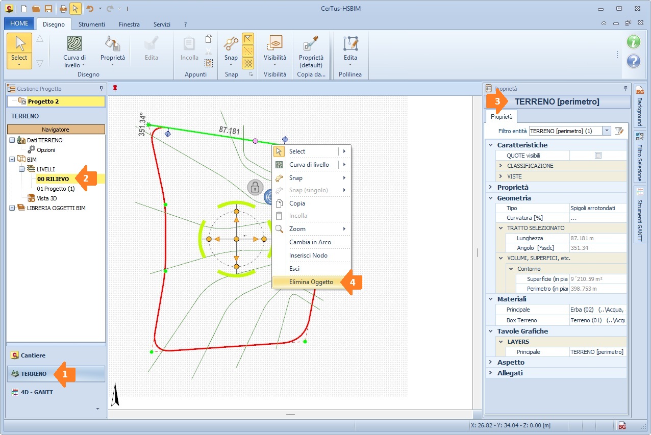 | Come eliminare il TerrenoPatrizio 2026-04-07 11:15:43 Voglio condividere una richiesta di assistenza Richiesta: Ho realizzato il Terreno, ma ora vorrei cancellarlo. Come procedo? Risposta: Per eliminare il terreno occorre procedere come di seguito descritto: - accedere all'ambiente TERRENO; - portarsi sul livello "00 Rilievo" - cliccare con il tasto sinistro del mouse su un tratto del perimetro del Terreno (il perimetro del Terreno è colorato di rosso, mentre il tratto selezionato è di color verde) - nel toolbox delle Proprietà, nella parte alta si leggerà TERRENO [perimetro]; - cliccare il tasto destro del mouse sul tratto selezionato - dal menu locale selezionare l'opzione Elimina Oggetto; - confermare il successivo messaggio cliccando su "SI". Clicca QUI per visualizzare una immagine. ATTENZIONE con la cancellazione del TERRENO, viene eliminato il Terreno e TUTTI i livelli in esso rappresentati. L'operazione una volta confermata non può essere annullata. |