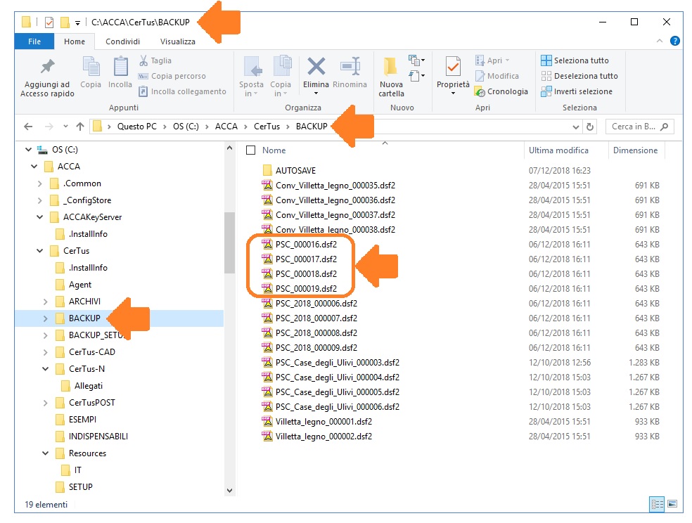 | Piano cancellato: come recuperare una copia di backupGiuseppe 2015-08-20 10:27:10 Voglio condividere una richiesta di assistenza. Richiesta Ho cancellato per errore un Piano di Sicurezza. CerTus esegue le copie di backup? Se si, come bisogna procedere per ripristinarle? Risposta CerTus ad ogni salvataggio esegue una copia di 'backup' del piano nella cartella 'BACKUP'. Per ogni documento il programma conserva gli ultimi 4 salvataggi effettuati; quindi, il PIANO che nel nome riporta il numero progressivo più alto corrisponderà all'ultimo salvataggio effettuato sul documento originario. Per ripristinare le copie di backup dei documenti, basta procedere nel seguente modo: 1) portarsi nella cartella 'BACKUP' contenuta nella cartella di installazione del programma (di default C:\ACCA\CerTus\BACKUP); 2) ricercare il file con il nome del Piano che si intende recuperare, ad esempio: 'PSC' (vedi immagine esplicativa). Importante il nome del Piano è seguito da un 'underscore' (trattino basso), da un numero progressivo e dall'estensione "dsf2" (ad esempio: 'PSC_000010.dsf2'). 3) copiare il file che riporta il numero progressivo più alto (nel nostro esempio: 'PSC_000019.dsf2') ed incollarlo in una cartella diversa o sul desktop; 4) rinominare il file (modificandolo, ad esempio, in "PSC_Recuperato.dsf2"); 5) aprire CerTus e di seguito aprire il piano. Discussione correlata ---> Cambiare il numero di copie di Backup ---> Cambiare la cartella di salvataggio delle copie di Backup |