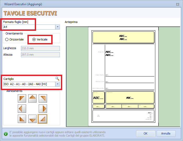 Risposta Per stampare soltanto la testata è sufficiente: 1. Creare una nuova tavola esecutiva. 2. Impostare come formato foglio l’A4 verticale o orizzontale. 3. Selezionare il cartiglio “ISO A2 - A1 - A0 - 2A0 - 4A0 [HV]”.