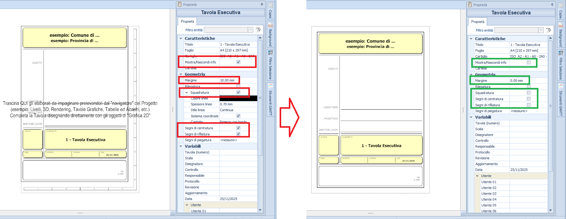 Una volta generata la Tavola esecutiva, eseguire i seguenti passaggi di configurazione: 1. Mostra/Nascondi info → disattivare la spunta. 2. Margine → impostare il valore da 10.00 a 0.00. 3. Squadratura → disattivare la spunta. 4. Segni di centratura → disattivare la spunta. 5. Segni di rifilatura → disattivare la spunta.