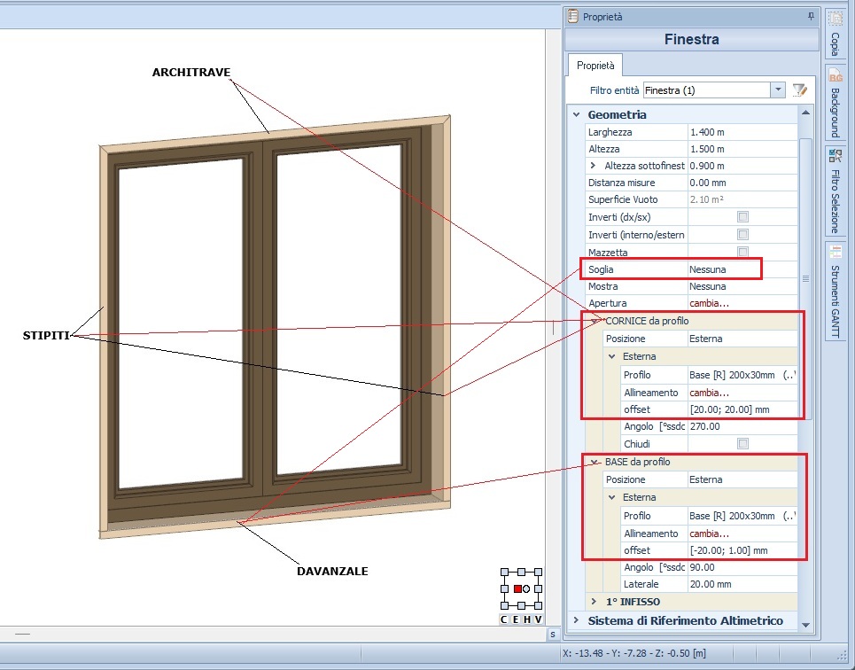 Risposta Per inserire una cornice in marmo (o altro materiale) attorno alla finestra è sufficiente seguire questi passaggi: - inserisci la finestra nel muro - selezionala e, in Cornice da profilo, imposta Posizione → Esterna - scegli il profilo da utilizzare in base a larghezza e spessore dell’elemento costruttivo (stipiti e architrave) - imposta l’allineamento corretto - definisci l’offset (rispetto agli assi X e Y) per traslare l’elemento - vai in Base da profilo e imposta Posizione → Esterna - scegli il profilo da utilizzare in base a larghezza e spessore dell’elemento costruttivo (davanzale/soglia) - imposta l’allineamento corretto - definisci l’offset (rispetto agli assi X e Y) per traslare l’elemento - in alternativa, per il davanzale è sufficiente attivare l’opzione Soglia e selezionare il tipo Singola