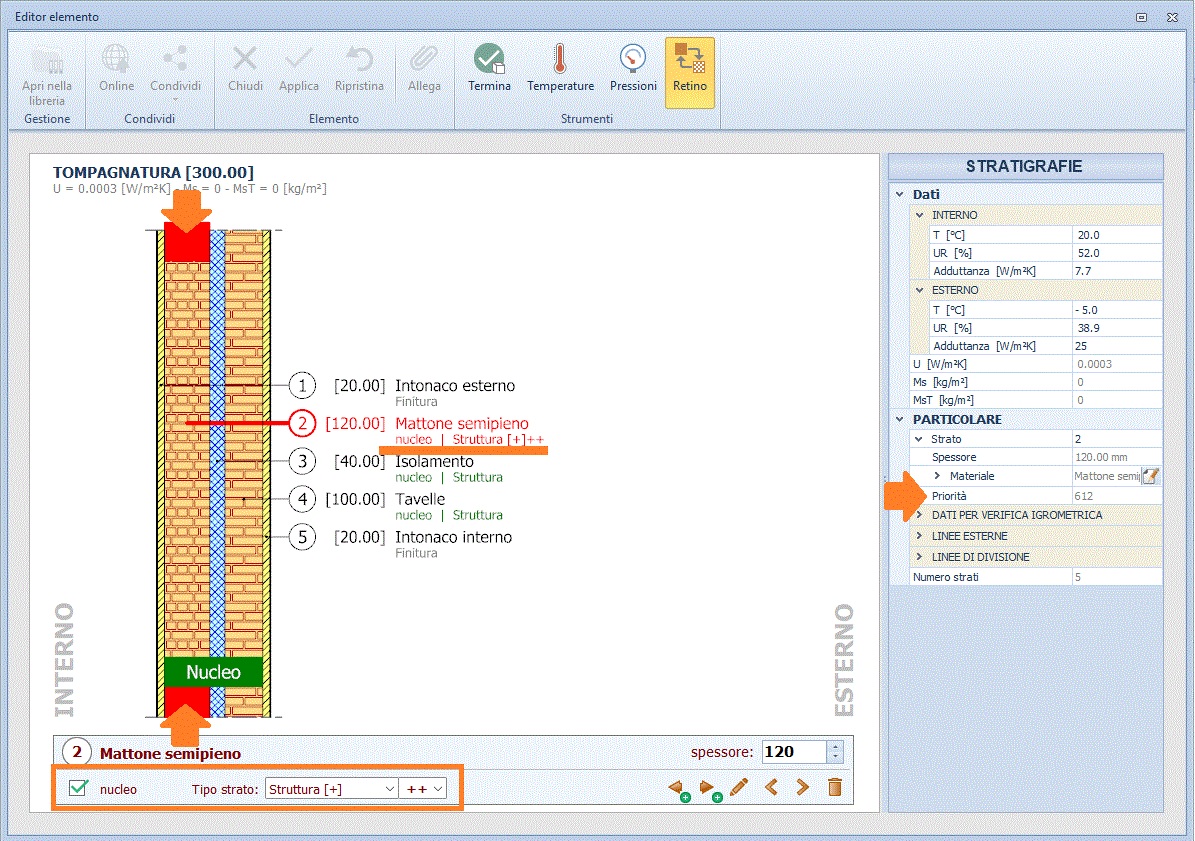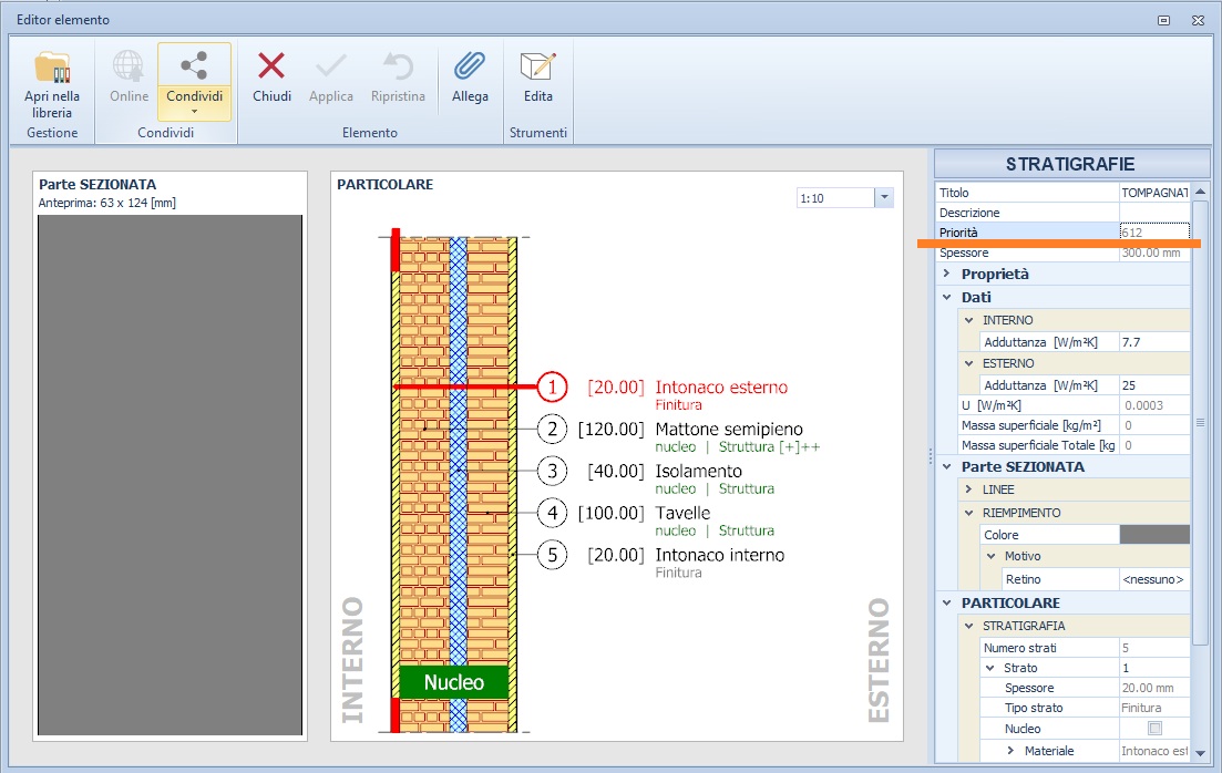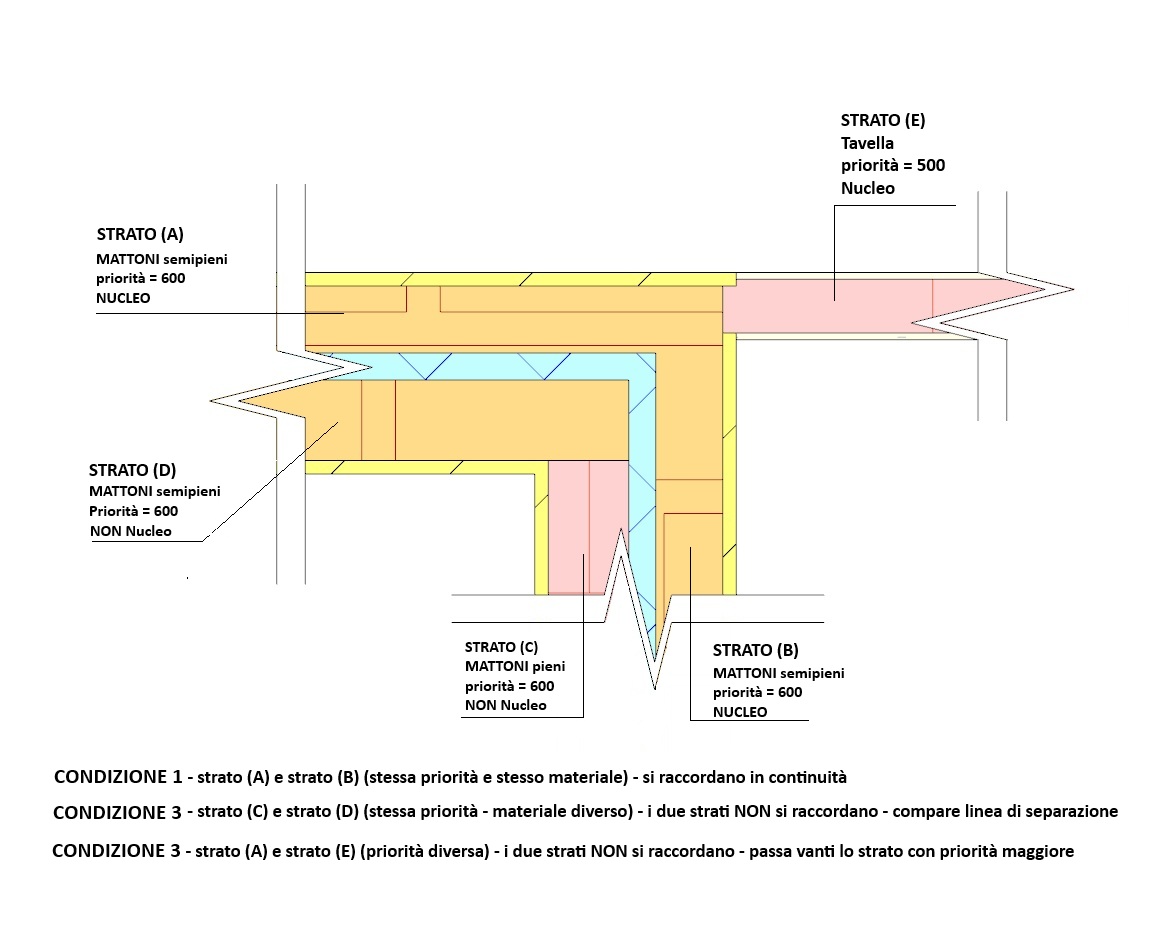 | Stratigrafia Involucro: cosa si intende con le sigle "Struttura", "Finitura" e "Nucleo"Patrizio 2026-03-09 16:50:03 Voglio condividere una richiesta di assistenza Richiesta Nella personalizzazione di una stratigrafia noto che a ciascuno strato è assegnato una definizione, alcuni sono individuati come "Finitura" altri come "Struttura". Inoltre alcuni di questi strati sono classificati come "Nucleo". Cosa significano queste definizioni ed a cosa servono? Risposta Vediamo dapprima cosa significano queste sigle e cosa si ottiene definendole. Nella definizione di una stratigrafia è possibile per ciascuno strato che compone la stratigrafia definire una "classificazione" con l'obiettivo di fissare il grado di priorità dello strato in primis ed a seguire dell'intera stratigrafia. La classificazione prevede diversi "tipologie": - Finitura; - Struttura; - intermedio; - Barriera al vapore; - Aria; - Isolamento. A ciascun "tipo di strato" corrisponde una "priorità" ossia un valore numerico: - Finitura >>> valore di "priorità" pari a 100; - Aria >>> valore di "priorità" pari a 200; - Isolamento >>> valore di "priorità" pari a 300; - Barriera al vapore >>> valore di "priorità" pari a 400; - Intermedio >>> valore di "priorità" pari a 500; - Struttura >>> valore di "priorità" pari a 600. Inoltre, nel definire il tipo di strato è possibile aumentare/ridurre la sua priorità, assegnando quindi un valore numero più alto o più basso di 10 punti rispetto al valore standard. Abbiamo quindi: - Finitura + >>> valore di "priorità" pari a 110; - Finitura - >>> valore di "priorità" pari a 90; - Aria + >>> valore di "priorità" pari a 210; - Aria - >>> valore di "priorità" pari a 190; - Isolamento + >>> valore di "priorità" pari a 310; - Isolamento - >>> valore di "priorità" pari a 290; - Barriera al vapore + >>> valore di "priorità" pari a 410; - Barriera al vapore - >>> valore di "priorità" pari a 390; - Intermedio + >>> valore di "priorità" pari a 510; - Intermedio - >>> valore di "priorità" pari a 490; - Struttura + >>> valore di "priorità" pari a 610. - Struttura - >>> valore di "priorità" pari a 590. Sempre con l'obiettivo di stabilire il grado di priorità è possibile, ridurre o aumentare di uno o due punti il valore mediante i simboli: - (++) >>> 2 punti in più - (--) >>> 2 punti in meno - (+) >>> 1 punti in più - (-) >>> 1 punti in meno Facciamo un esempio: se uno strato lo classifichiamo come Struttura (+) ed aggiungiamo il simbolo (++) avremo come valore di priorità 612. Che risulta essere il punteggio di priorità MASSIMA che può assumere il singolo strato. Clicca QUI per visualizzare una immagine. IN CONCLUSIONE A ciascun singolo strato che compone una stratigrafia, può essere assegnata una classificazione. Eseguire questa operazione comporta l'assegnazione di un punteggio allo strato, punteggio che ne definisce la sua "priorità". IN ULTIMO, anche la Stratigrafia stessa ha una sua Priorità ed è pari alla priorità maggiore dei singoli strati che la compone. Ricollegandoci all'esempio di prima, sicuramente il valore di Priorità della stratigrafia sarà 612 ossia pari al valore maggiori del valore di priorità del singolo strato. Clicca QUI per visualizzare una immagine. Chiarito cosa sono queste classificazioni, come funzionano e cosa restituiscono, vediamo a cosa serve definire la priorità dello strato. La definizione della priorità di ciascuno strato permette a Edificius, nelle tavole grafiche di tipo Pianta con attiva la visualizzazione delle stratigrafie, di gestire i raccordi tra gli strati di due o più involucri. Individuando quale strato si raccorda con un altro in continuità oppure quale strato passa davanti ad un altro. Nelle tavole grafiche di tipo "Pianta" il software per effettuare i raccordi tra strati applica in generale 2 regole: - gli strati con la medesima priorità si raccordano in continuità tra loro (ad esempio "struttura con struttura" - "intonaco con intonaco" eccetera); - gli strati con priorità più alta (ad esempio "struttura") attraversare quelli con priorità più bassa (ad esempio "intonaco"). Tutto ciò premesso, occorre sapere che agli strati che compongono la stratigrafia è possibile assegnare una ulteriore classificazione, quella di Nucleo. Il Nucleo di un involucro è un raggruppamento logico degli strati che ne identificano la "struttura principale". Ad esempio, in una muratura composta da un doppio strato di intonaco esterno/interno, uno strato di isolante e la parte centrale composta da un mattone pieno, il nucleo (la struttura principale) è sicuramente lo strato di mattoni pieni. Tutti gli altri strati (intonaci, rivestimenti, ecc.) saranno esterni al nucleo. Assegnare la classificazione "Nucleo" ad uno strato, non aggiunge ulteriore "valore" alla priorità dello strato, ma concorre in modo importante alla definizione dei raccordi tra due o più involucri. Come in precedenza indicato, il software nel gestire i raccordi tra involucri applica delle regole generali. Vediamole nel dettaglio. Nei raccordi tra due o più involucri sono definite 2 zone (parliamo di zone "fittizie" e non visibili graficamente): 1) una ZONA coincidente con il nucleo della stratigrafia; 2) una ZONA coincidente con gli strati esterni al nucleo. In ciascuna di queste zone "entrano" solo determinati strati: - nella zona definita come "NUCLEO" entrano SOLO gli strati per i quali si è definita la caratteristica "Nucleo"; - gli strati per i quali NON si è definita la caratteristiche Nucleo NON possono entrare nel nucleo - quindi rientrano nella seconda zona. In ciascuna zona vince lo strato con la priorità maggiore. QUINDI, in ogni zona possono verificarsi le seguenti condizioni: Condizione 1 strati con stesso valore di priorità - stesso materiale >>> i 2 strati si raccordano in continuità; Condizione 2 strati con stesso valore di priorità - ma materiali diversi >>> i 2 strati NON si raccordano - tra i due strati è inserita una linea di separazione;