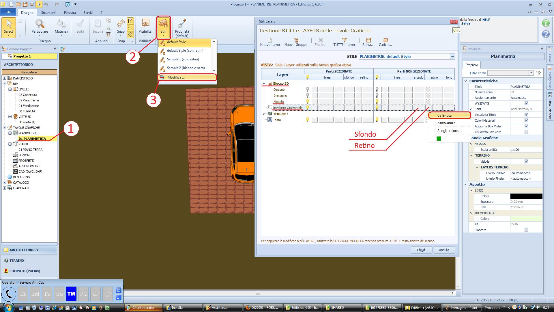 | Giovanni 2014-11-19 09:36:05 Provi a modificare lo stile dei layer come di seguito descritto: - aprire la "planimetria" o la "pianta"; - cliccare il bottone "Stili"; - scegliere "modifica"; - attivare i seguenti layer: 1. relatvo all'oggetto con la texture degli autobloccanti (soletta o involucro orizzontale), impostare "da entità" allo sfondo e al retino. 2. del "modello" relativo ai blocchi 3D e disattivare "disegno" e Immagine". Guardi anche l'immagine allegata. gestione_stili.jpg |