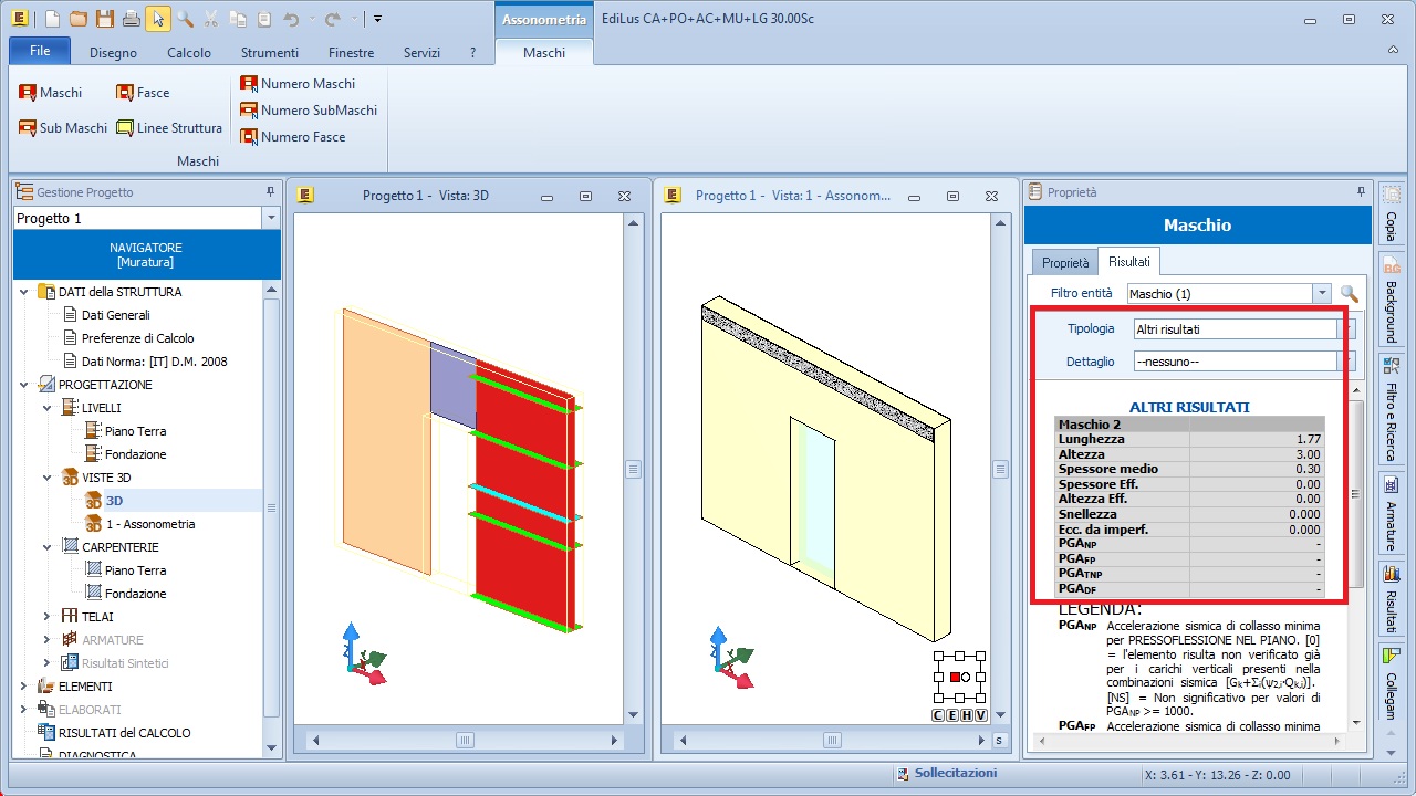 | AntonioDL 2015-12-18 11:36:31 L'altezza del livello deve essere intesa da calpestio a calpestio del livello superiore. Se ha inserito il cordolo, l'altezza del maschio è pari all'altezza del muro - (meno) l'altezza del cordolo (quindi 3.00 m nel suo caso), come può vedere, dopo avere eseguito almeno il calcolo delle sollecitazioni, selezionando il maschio murario (nella vista 3D Maschi) nella toolbox Proprietà, tab Risultati -> Altri risultati (vedi immagine esplicativa: maschi). |