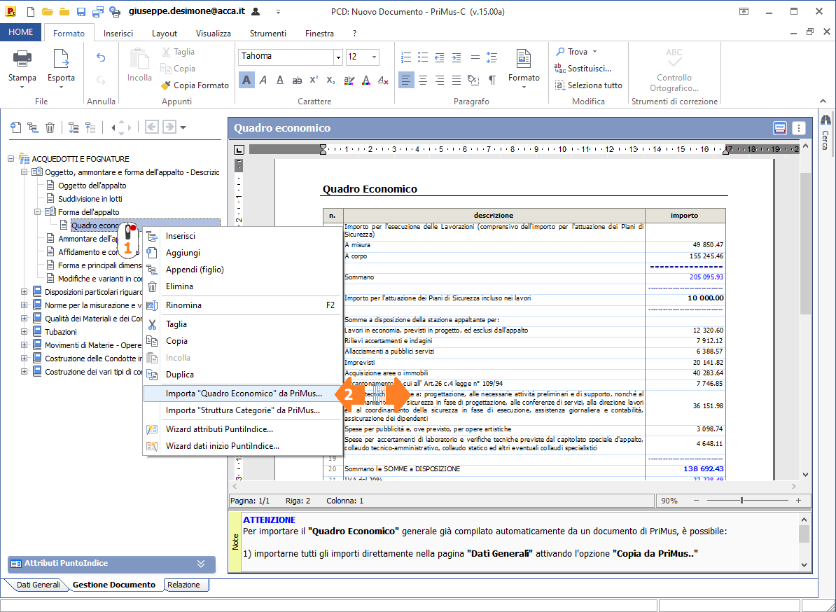 | Giuseppe 2025-01-31 17:42:56 Uno dei plus che si ha avendo il Servizio AmiCus attivo per PriMus-C è quello di non dover disporre necessariamente del computo metrico per redigere il Capitolato; la banca dati di PriMus-C contiene già i modelli e capitolati da utilizzare per la redazione dei documenti. I capitolati messi a disposizione da ACCA sono già densi di informazioni e con le varie normative di riferimento già presenti (non vi è quindi necessità, da parte dell'utilizzatore, di citare norme specifiche); quindi, utilizzando PriMus-C, il documento va creato sulla base della Banca Dati di cui si dispone. Dal computo di PriMus è comunque possibile importare diverse tipologie di informazioni, cito ad esempio: - il Quadro Economico - i Dati Generali - la Struttura delle categorie - le Voci di Misurazione - le Voci di Elenco Prezzi Di seguito propongo due immagini che mostrano come importare dal computo di PriMus i dati che personalmente ritengo utili: Come importare il Quadro Economico ![]() --> clicca qui per vedere il breve filmato che mostra come eseguire la procedura su proposta Come importare i Dati Generali ![]() Discussione correlata: --> clicca QUI per vedere come creare un 'nuvo documento' sfruttando i modelli ACCA  |