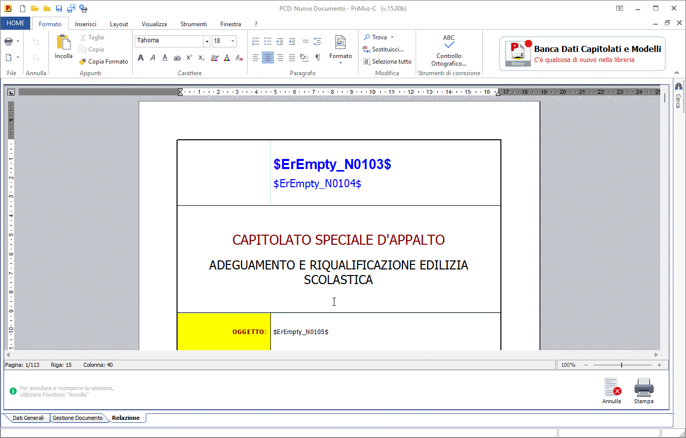 Operativamente: Nella pagina Relazione del documento, dopo aver compilato la relazione stessa, basta editare il piè di pagina ed aggiungere manualmente il numero totale di pagine. Terminata la modifica del piè di pagina, il testo inserito (in questo caso il 'numero totale di pagine') sarà riportato automaticamente su tutte le pagine della relazione.