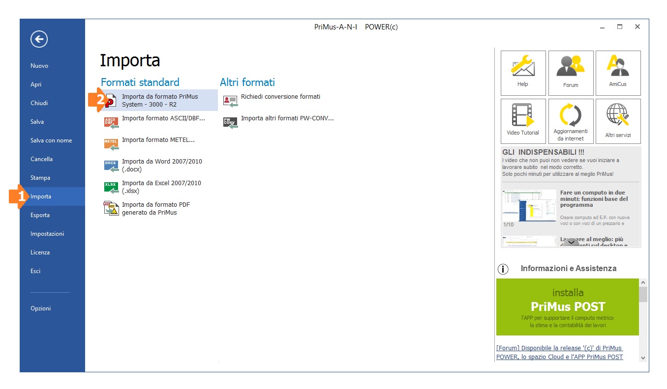 | Felice 2015-12-16 17:56:38 Per ottenere quanto richiesto con PriMus POWER o versioni successive, occorre selezionare 'Importa da formato PriMus System - 3000 – R2' nella pagina 'Importa' della 'Home' (menu 'File') del programma --> vedi immagine esplicativa COME PROCEDERE 1) aprire 'PriMus Power' o versioni successive; 2) selezionare 'Importa' dalla 'Home'; 3) cliccare 'Importa da formato PriMus System - 3000 – R2'; 4) nel dialog 'Importa da File System – 3000 – R2':