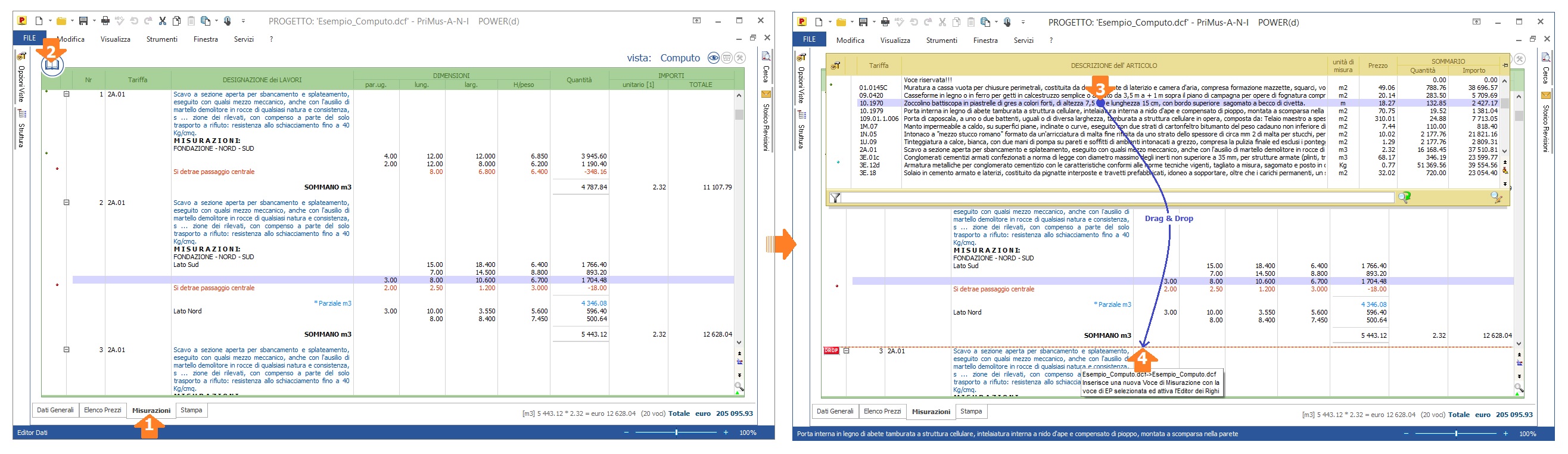 Felice | Felice 2016-02-15 19:20:58 Quanto richiesto si ottiene con semplici operazioni di 'Drag & Drop'. A) Nel caso le voci sono contenute in un documento 'Listino' diverso dal documento 'Computo', basta: 1) aprire i due documenti ed affiancarli (il computo da un lato e il listino dall'atra); 2) prendere le voci dall'editor 'Elenco Prezzi' del documento 'Listino', trascinarle con il 'Drag & Drop' e rilasciarle nell'editor 'Misurazioni' del documento 'Computo'. --> vedi il filmato: 'la gestione di più documenti e le funzioni di Drag & Drop' B) Nel caso le voci sono contenute nell'editor 'Elenco Prezzi' dello stesso documento 'Computo', basta: 1) aprire il 'Tool dell'Elenco Prezzi' dalla vista 'Computo' del documento; 2) prendere le voci, trascinarle con il 'Drag & Drop' e rilasciarle nell'editor 'Misurazioni'. --> vedi immagine esplicativa Video correlati: --> Fare un computo in due minuti: funzioni base del programma |