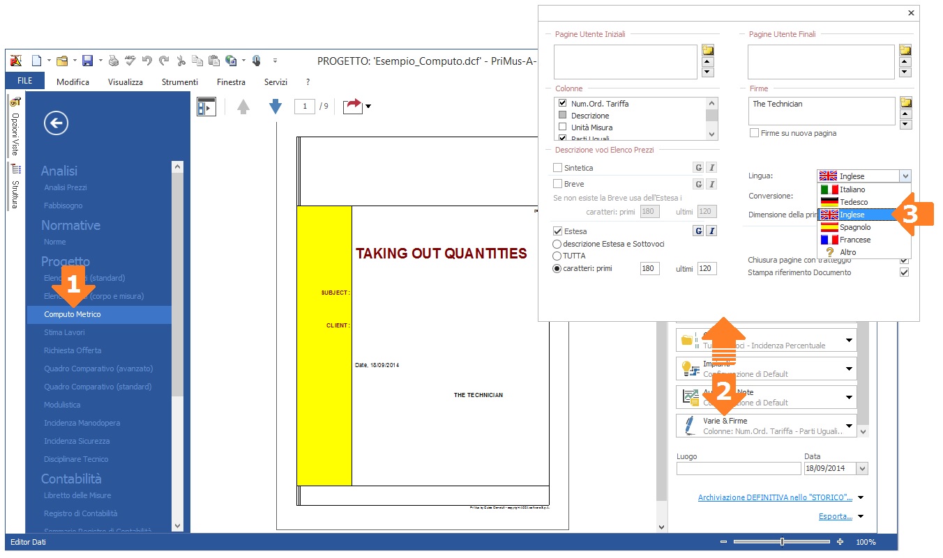 | Felice 2014-09-18 15:23:06 I testi di ciascun layout di stampa sono già multi lingua (Italiano, Tedesco, Inglese, Spagnolo e Francese). Per ottenere quanto richiesto è sufficiente scegliere la "Lingua" desiderata dalla pagina "Varie & Firme" delle impostazioni di stampa. COME PROCEDERE 1) selezionare l'elaborato; 2) aprire il dialog "Varie & Firme"; 3) scegliere la lingua dal combo box "Lingua". --> vedi immagine esplicativa Nota - PriMus non dispone di un traduttore e, quindi, l'eventuale traduzione dei testi inputati nel documento (descrizione delle voci, delle misurazioni, dei dati generali, etc.) sono a cura dell'utente. |