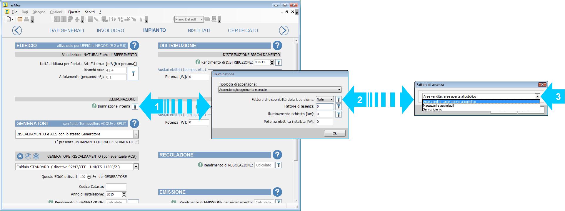 Antonio | Antonio 2016-04-19 12:06:39 Nella pagina IMPIANTO dei progetti del tipo CERTIFICAZIONE (APE) "VELOCE" quando la destinazione d'uso è diversa da 'residenziale' viene appunto resa attiva/disponibile la sezione 'Illuminazione'. A destra del campo 'Illuminazione interna' basta pigiare il bottone per accedere al dialog di descrizione delle caratteristiche del sistema. Nel dialog 'Illuminazione' così proposto per i vari campi sono disponibili i bottoni per accedere ai Prospetti della norma tecnica con valori tabellati. Pigiando il bottone a destra del campo 'Fattore di Assenza' verrà proposto l'omonimo dialog nel quale risultano già filtrate le varie tipologie di ambienti che il prospetto della norma prevede per la destinazione d'uso selezionata nei Dati Generali. Effettuata la scelta nel campo verrà automaticamente introdotto il valore previsto in norma tecnica. NOTA: se effettuata la scelta il valore proposto è '0' (zero) non trattasi di errore oppure necessità di input manuale del dato, semplicemente in norma tecnica per il tipo d'uso del vano è previsto proprio un valore nullo. Clicca QUI per vedere un'immagine esplicativa |