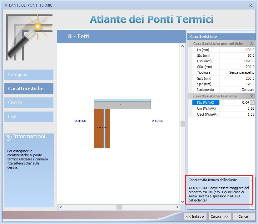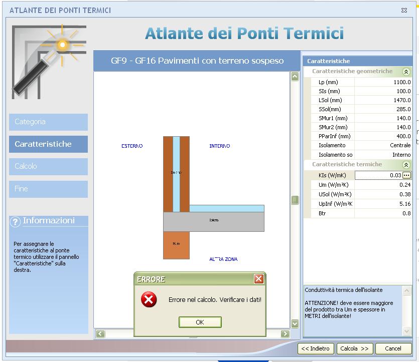 | Antonio 2014-12-12 15:56:47 Il messaggio "Errore nel calcolo. Verificare i dati." può essere proposto anche quando sono stati definite le "Caratteristiche geometriche" e le "Caratteristiche termiche". Nello specifico tale condizione è generalmente riscontrabile quando il valore della "Conduttività termica dell'isolante" è inferiore al "prodotto tra Um e spessore dell'isolante (espresso in metri)". Tale condizione è evidenziata da apposita "ATTENZIONE" visibile proprio quando il cursore del mouse è posizionato nel campo della "Conduttività termica dell'isolante". |