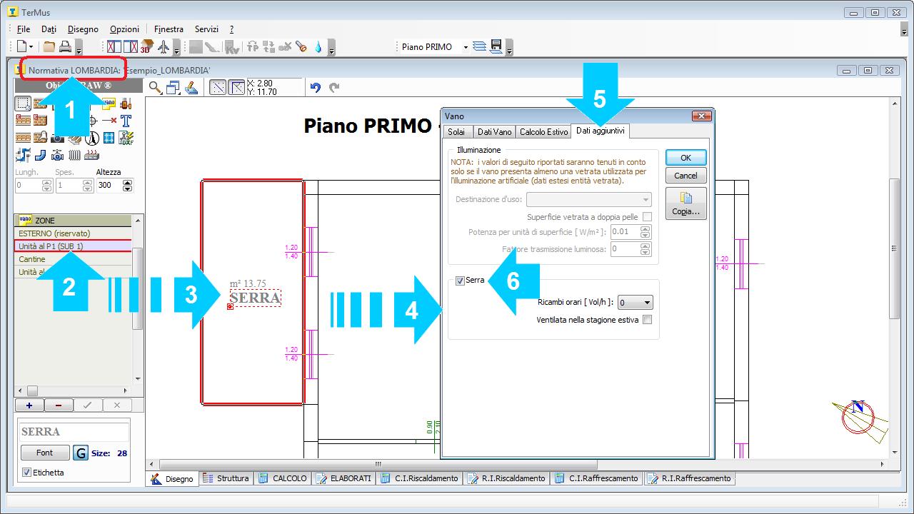 Antonio | Antonio 2014-12-29 09:57:44 Dopo aver verificato che effettivamente il progetto sia stato creato con Normativa Lombardia, per definire la serra bioclimatica è necessario: 1. disegnarne l'area di contatto con il volume riscaldato; 2. assegnare l'etichetta vano Serra alla Zona Calcolata; 3. nei Dati estesi del vano accedere alla pagina Dati Aggiuntivi ed attivare il check Serra. Clicca il link per vedere un'immagine esplicativa 24310_1419843450_serra_lombardia.jpg |