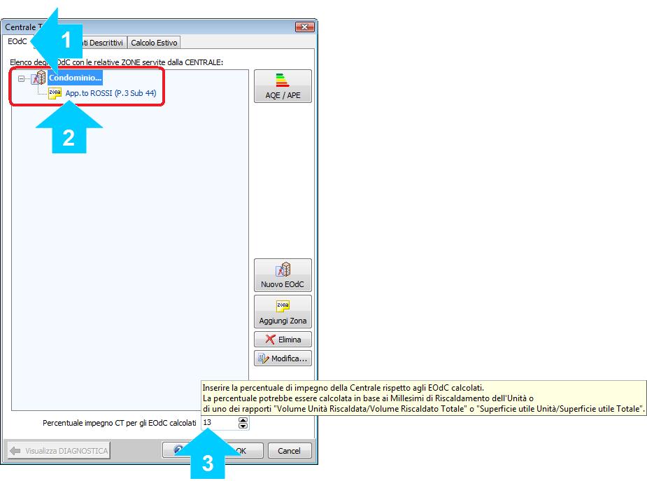 | Antonio 2015-01-15 10:40:39 La Struttura del Generatore/Caldaia a servizio dell'intero condominio va definita con le sue esatte caratteristiche. All'inserimento della Centrale Termica sul disegno nella pagina EOdC va inserito un unico EOdC comprensivo di un'unica zona (quella dell'appartamento da certificare). Nella stessa pagina EOdC dei dati estesi della Centrale Termica va inserita la Percentuale impegno CT per gli EOdC calcolati che può essere stimata in base a: 1. Millesimi di Riscaldamento 2. rapporto Volume Unità Riscaldata/Volume Riscaldato Totale 3. rapporto Superficie Utile Unità/Superficie Utile Totale Clicca il link per vedere un'immagine esplicativa PercentualeCT.jpg |