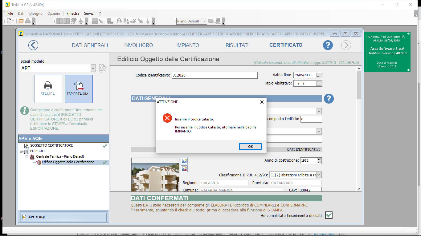 | User_131498 2020-06-03 11:03:05 Salve, ho completato un calcolo con Termus-Ce per un piccolo appartamento al mare privo di impianto di riscaldamento. Devo esportare il file in formato XML ma il programma non me lo permette, mi chiede di inserire il codice catasto nella sezione impianti. Ma, non essendoci impianto di riscaldamento, la sezione risulta disabilitata. Come posso procedere? Grazie!129145_1591174979_termus.jpg |