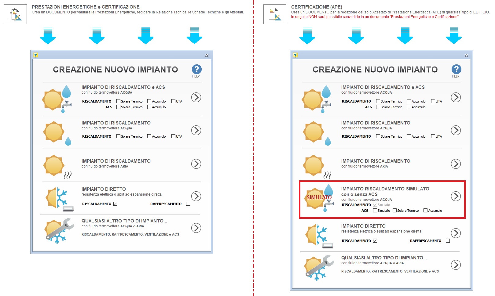 Antonio | Antonio 2024-05-13 14:34:46 L'impianto SIMULATO nel wizard impianti è sempre presente a meno che non abbia creato un progetto del tipo PRESTAZIONI ENERGETICHE E CERTIFICAZIONE e non del tipo CERTIFICAZIONE (APE) questo a prescindere dalla release del programma ![]() Il progetto del tipo PRESTAZIONI ENERGETICHE E CERTIFICAZIONE presuppone si stia progettando ex novo o riqualificando un edificio nel quale gli impianti sono effettivamente presenti. La possibilità di ricorrere all'impianto SIMULATO è limitata per legge alla sola attività di certificazione energetica (emanazione APE). |