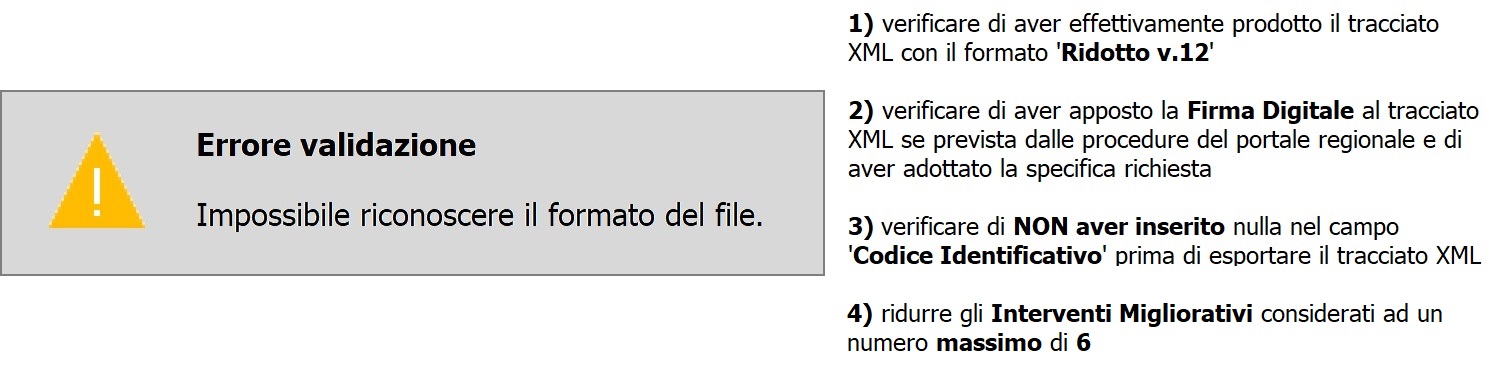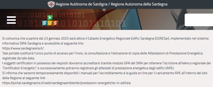 Antonio | Regione SARDEGNA: APE 2015Antonio 2025-01-20 11:38:37 ![]() Per la registrazione degli APE in Regione Sardegna è disponibile - a partire dal 23 gennaio 2025 - il Catasto Energetico Regionale Edifici Sardegna (CERESar), implementato nel sistema informativo SIRA Sardegna. TerMus e TerMus CE sono aggiornati alle normative vigenti e restituiscono l'APE conforme al modello ministeriale di cui all'Appendice B del Decreto 26.6.2015 'Linee Guida APE'. Riportiamo di seguito il comunicato della Regione Sardegna del 19 dicembre 2024. TerMus è pronto! Puoi sin da subito procedere all'esportazione del tracciato XML nel formato 'Ridotto v.12' (come indicato nel documento "Guida procedimenti APE" reso disponibile dalla Regione Sardegna) e registrare l'APE nella nuova modalità. VERIFICA SEMPRE DI AVER INSTALLATO LA VERSIONE/RELEASE PIU' AGGIORNATA ![]() Di seguito un elenco di link utili: ■ Portale SIRA Sardegna ■ Guida procedimenti APE ■ Guida rapida all'utilizzo del Gestore del Procedimenti Ambientali (GPA) ^ ^ ^ ^ ^ ^ ^ ^ ^ ^ ^ ^ ^ ^ ^ ^ ^ ^ ^ ^ ^ ^ ^ ^ ^ ^ ^ ^ [Rev.3 | 06-06-2025] <<< INFORMAZIONI UTILI su SEGNALAZIONI di ERRORE restituite dal portale regionale >>> Di seguito un elenco di alcune segnalazioni restituite dal portale alla registrazione del file XML con relativa soluzione: REGOLA 5 e REGOLA 11: clicca QUI Errore validazione - Impossibile riconoscere il formato del file: clicca QUI |