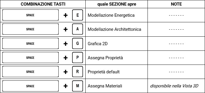 Shortcut SEZIONI del menu Disegno Gli shortcut da tastiera consentono di aprire rapidamente una sezione del menu Disegno. Attivando lo shortcut tramite la combinazione di tasti indicata, viene visualizzato a video un popup contenente la sezione del menu corrispondente.