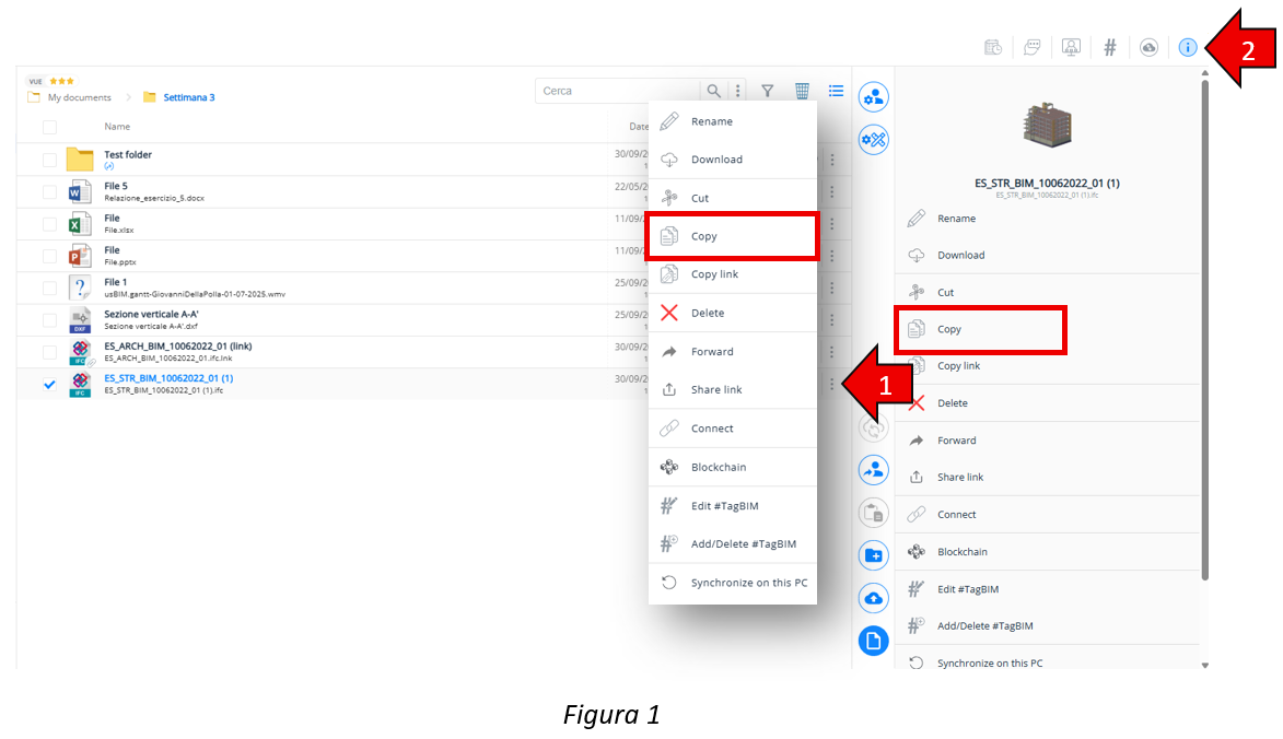 Una volta effettuato l’accesso alla piattaforma, per copiare un documento nella piattaforma per prima cosa bisognerà accedere alla cartella di origine del file, accedere al menu contestuale del file attraverso l’icona dei tre punti a lato del file (Freccia 1 Figura 1) oppure dalla sezione dettagli del file (Freccia 2 Figura 1) dopo averlo selezionato.